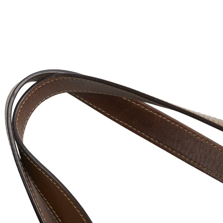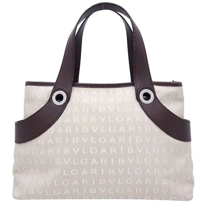 This tote bag features a canvas body with leather trim, flat leather straps, a top zip closure, and an interior zip pocket.