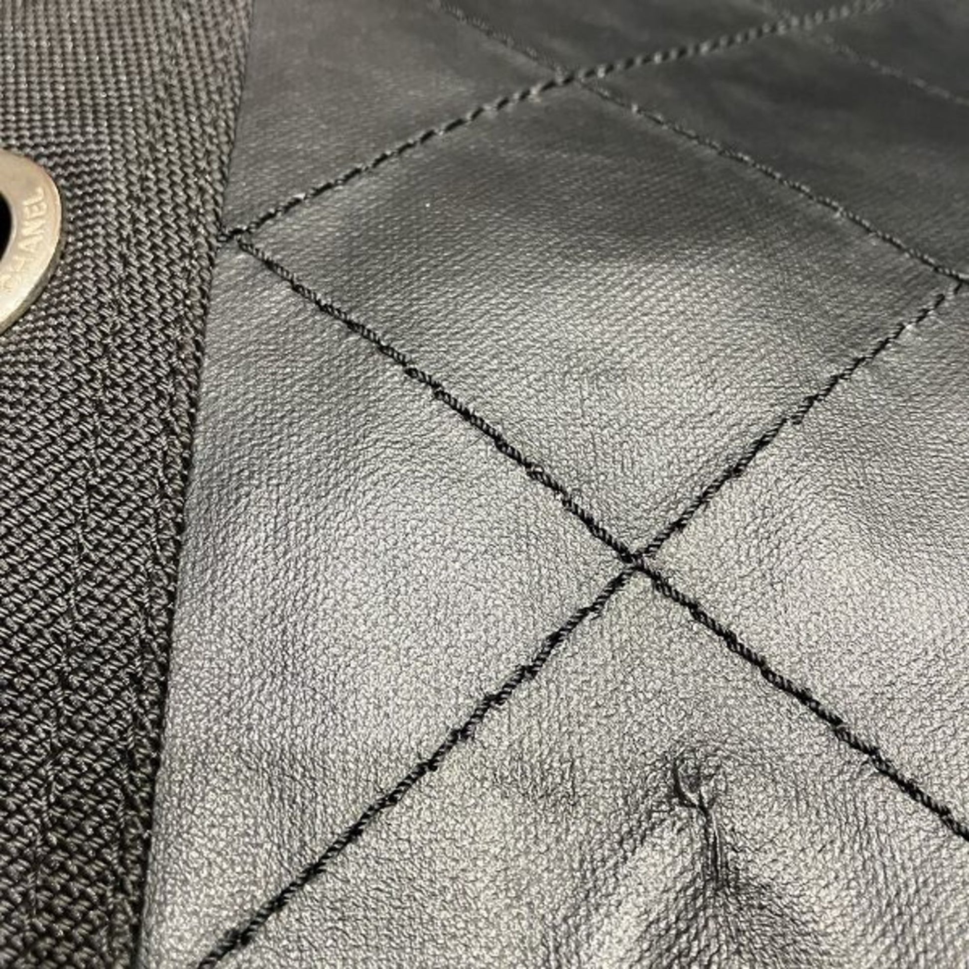 Black leather, grosgrains trim, quilted stitch pattern