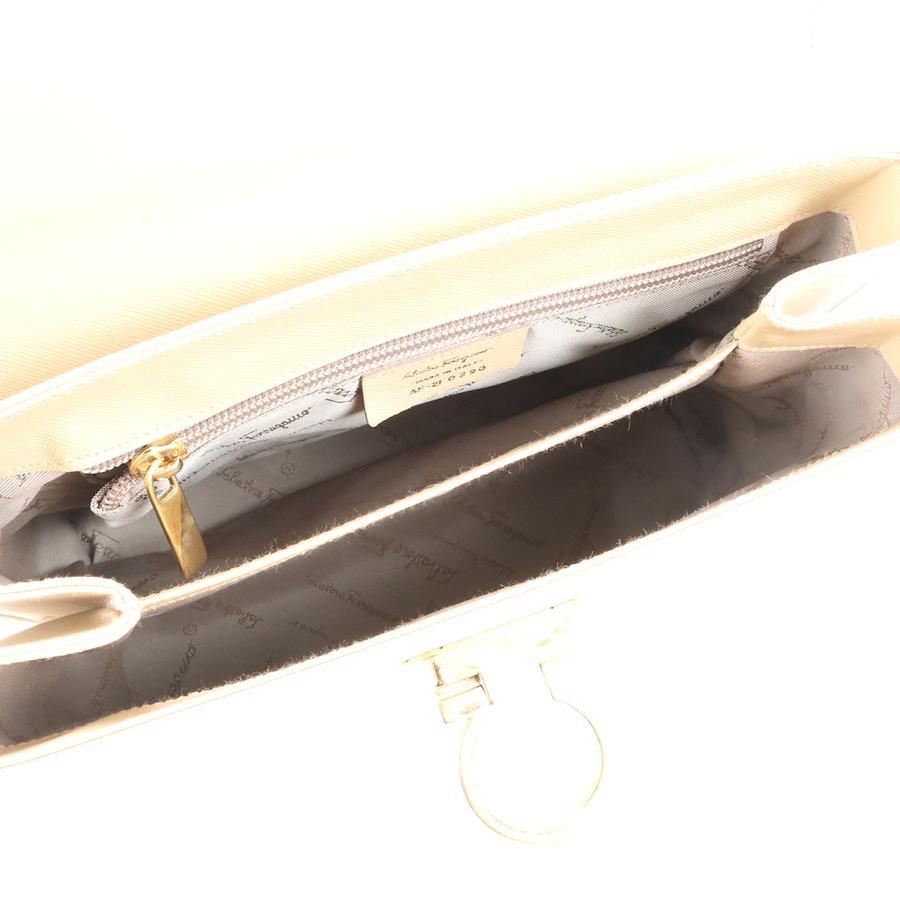 The Salvatore Ferragamo handbag in beige leather with gold hardware is a stylish top handle bag designed for women. Made from luxurious leather, this handbag features beige handles, exterior, lining, and hardware, giving it a chic and sophisticated look. The gold hardware adds a touch of elegance to the overall design, making it a perfect accessory for any outfit. Known for their quality craftsmanship and timeless style, Salvatore Ferragamo handbags are a must-have for any fashion-forward woman.